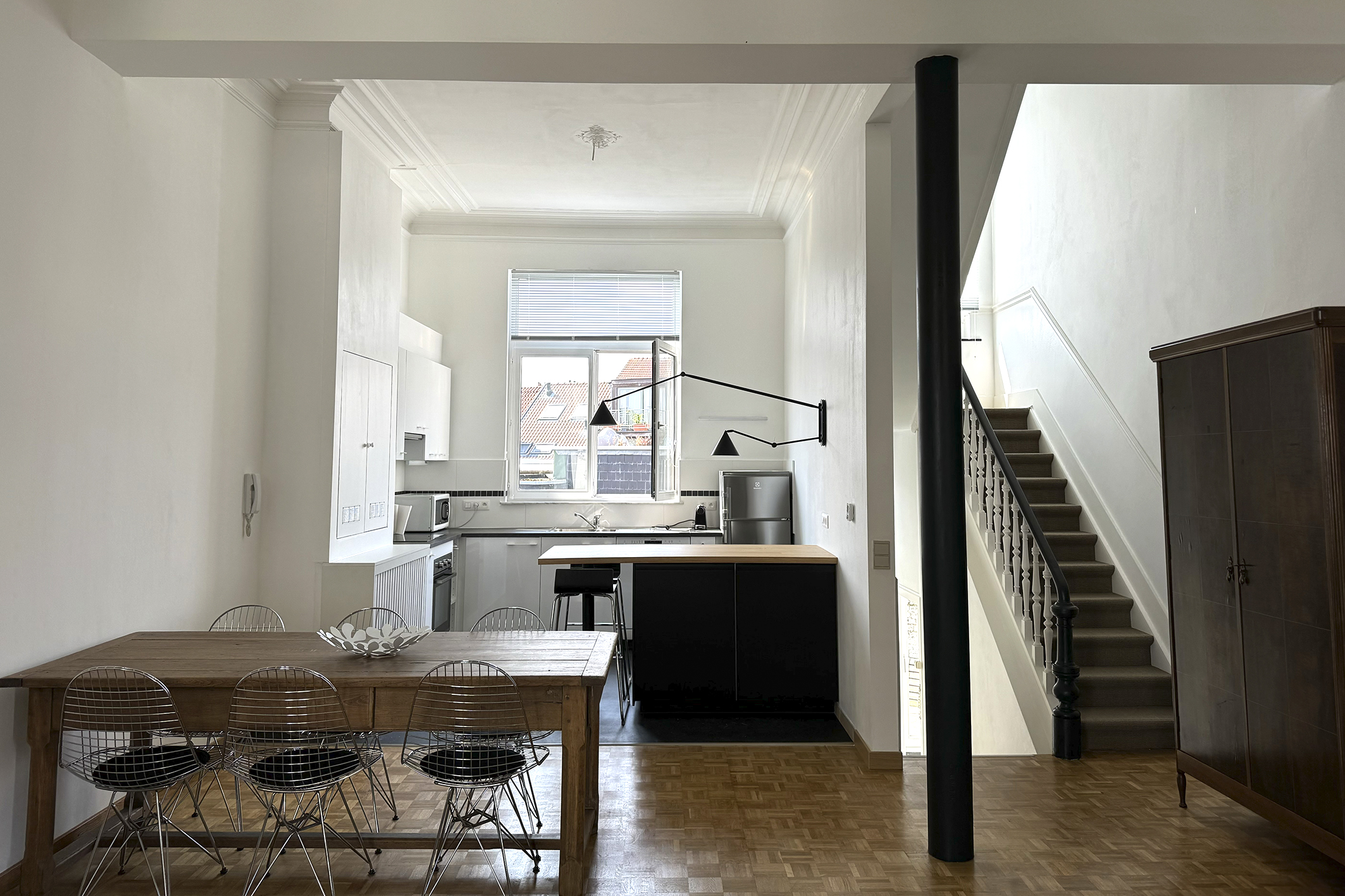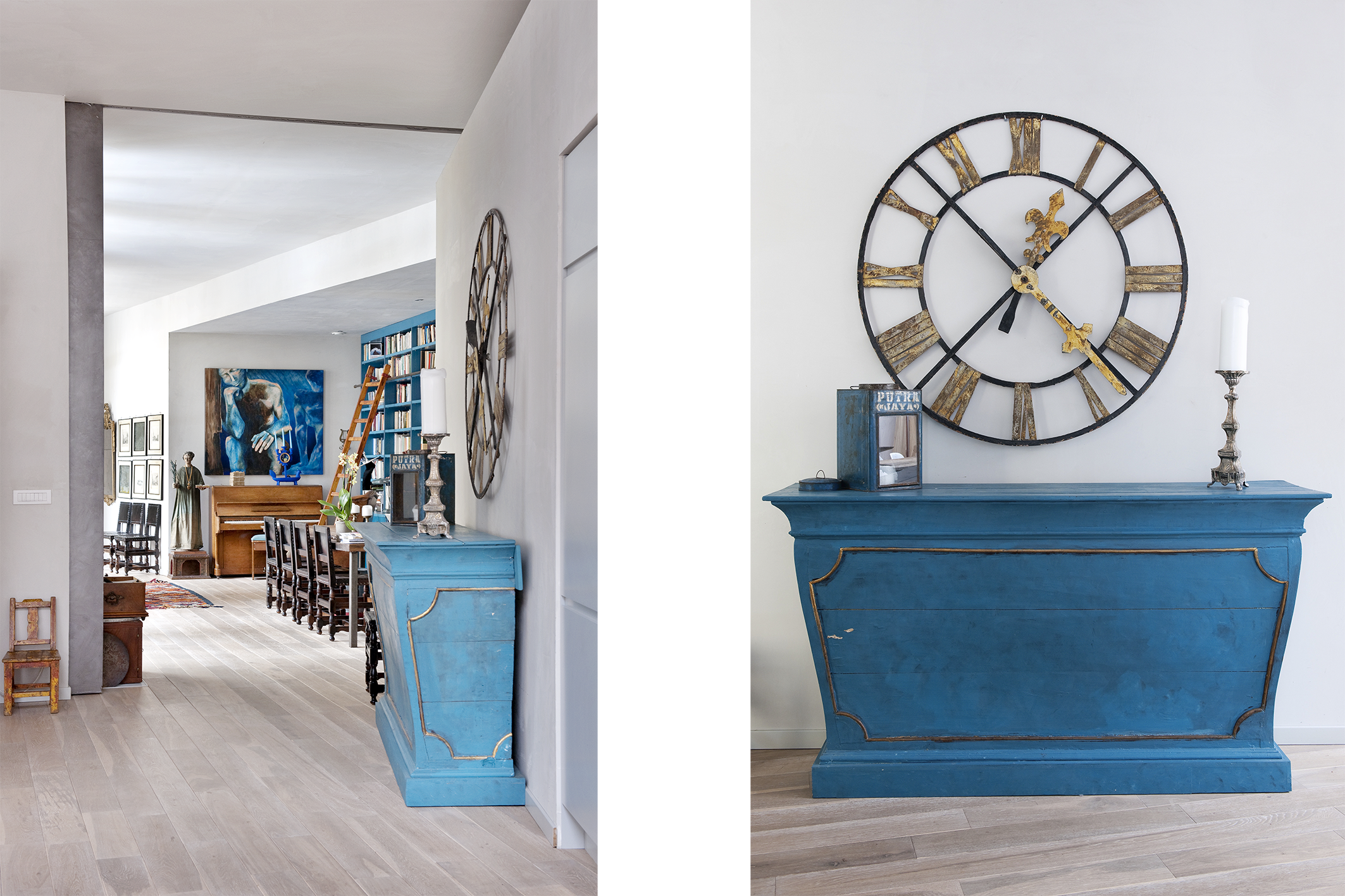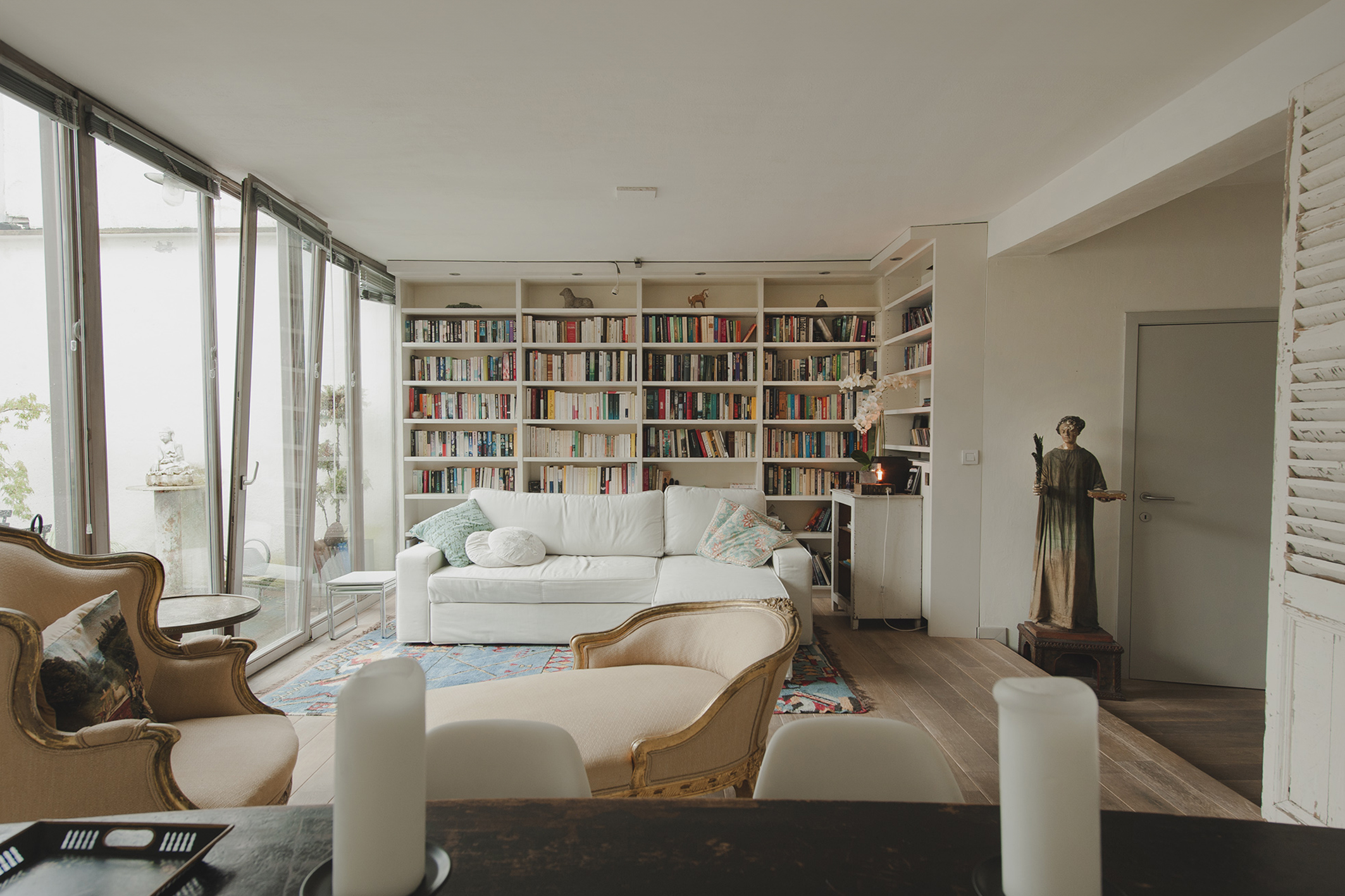 A sublime eclectic loft in the heart of Brussels emerges on a bright top floor. Here I celebrate my passion for blending seemingly contradictory worlds together: an audacious petrol blue library, Moroccan carpets, a touch of Flemish medieval, solid Scandinavian design furniture, balanced with contemporary artworks.