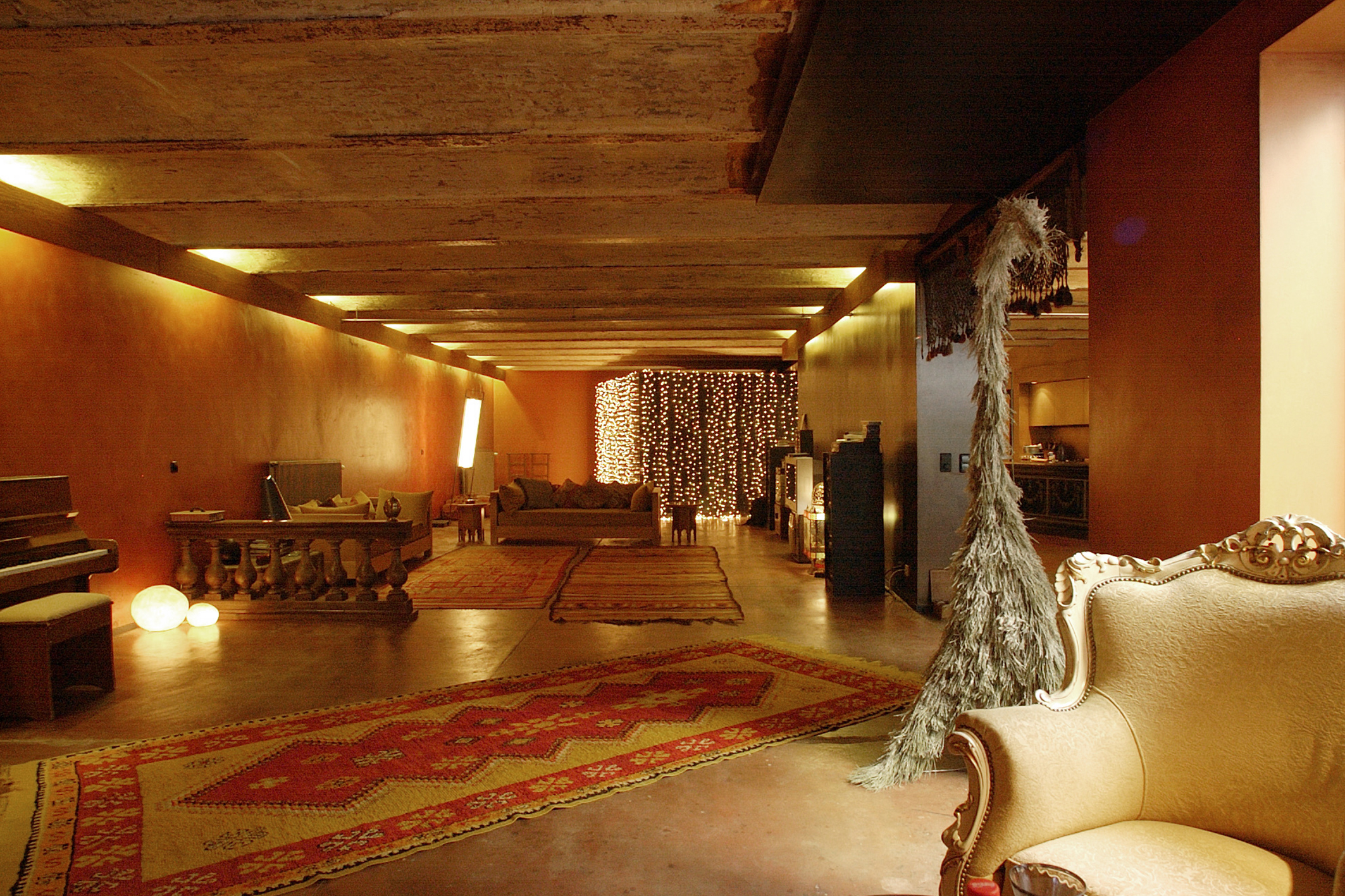 A dark industrial warehouse reimagined as an elegant residential loft. I combined dramatic lighting with a bold colour palette woven throughout the space to create a