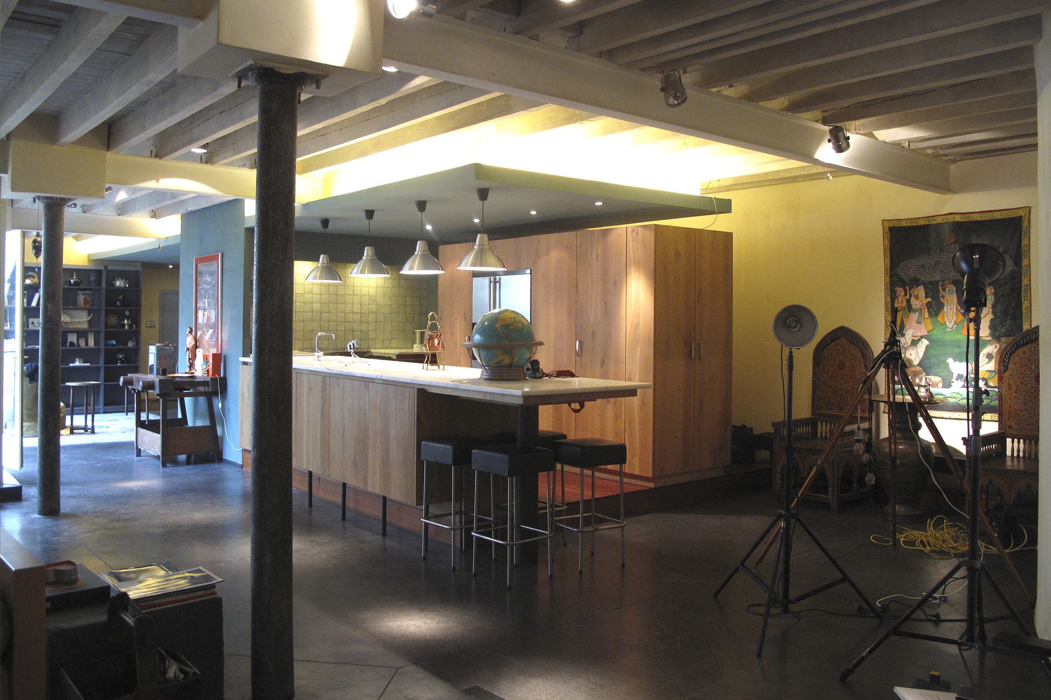 An open-concept office space transforms into a luxurious residence. It’s an oasis of peace by design, with elements such a welcoming oak-paneled American kitchen and spacious living area fit for glamorous entertaining or restful comfort.